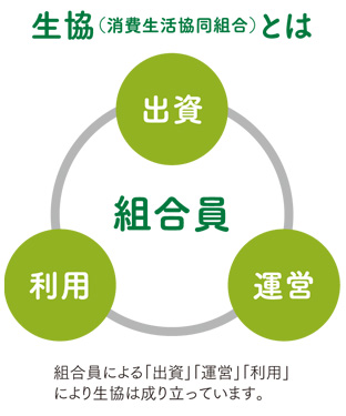 たとえば、株式会社は、企業が株主(出資者)を募ります。企業は顧客に商品を販売しますが、株主が買わなくても、その企業が利益を出せば目的は達成され、株主に配当が入ります。生協は、その事業を利用したい人(=組合員)を募ります。組合員は事業の資本として出資しますが、目的は配当ではなく、事業を利用することになります。株式会社と生協の一番の違いは、議決権です。株式会社は持ち株が多いほど発言権がありますが、生協は出資額にかかわらず組合員1 人につき1 票と、みな平等です。