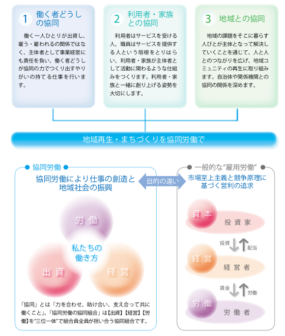 協同労働の協同組合は、共に生き、共に働く社会をめざして、市民が協同・連帯して、人と地域に